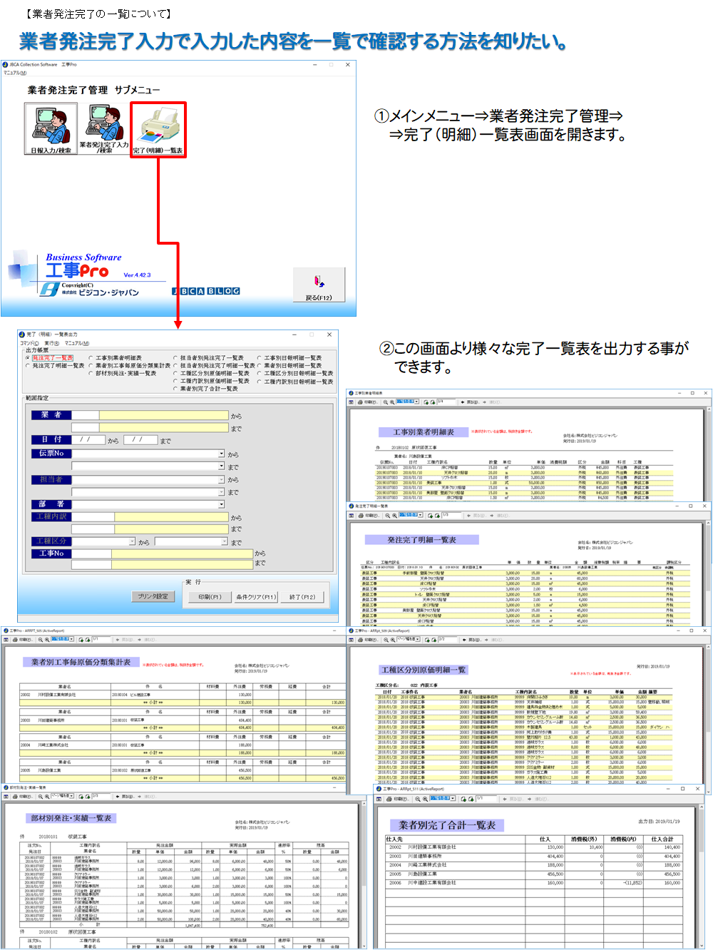 業者発注完了入力で入力した内容を一覧で確認する方法を知りたい。