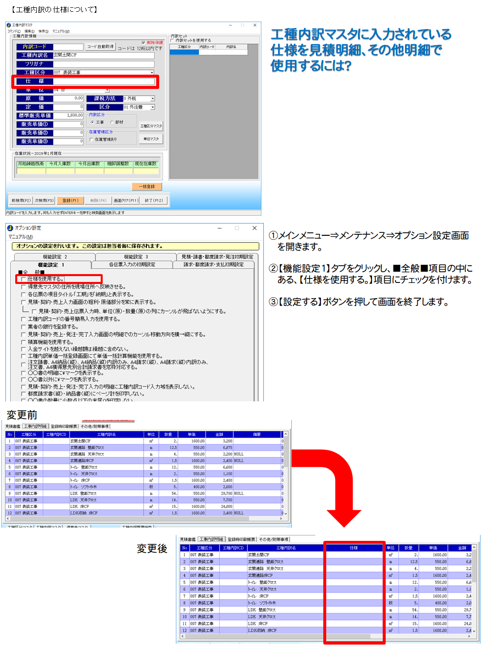 メインメニュー⇒メンテナンス⇒オプション設定画面にある【仕様を使用する。】のチェックを付けて 【設定する】ボタンを押していただくと、仕様が明細に表示されるようになります。