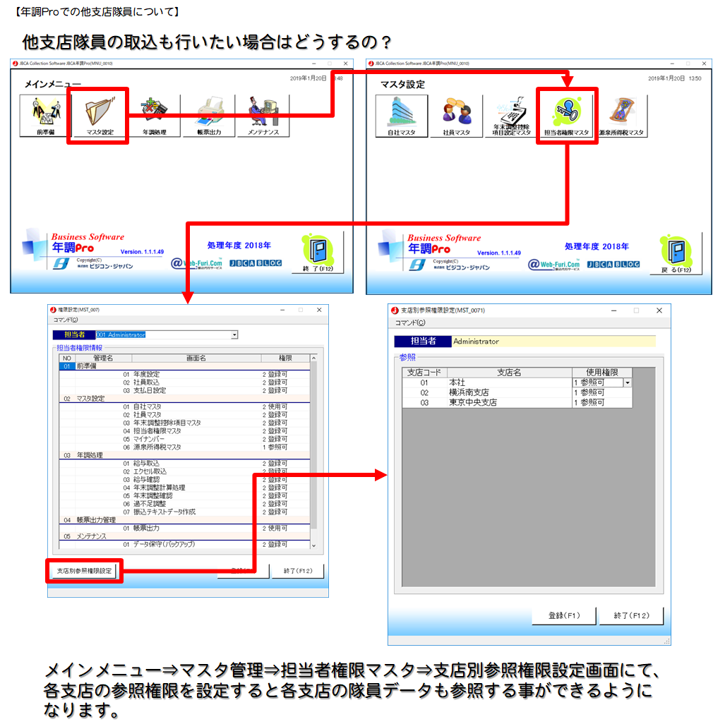 JBCA年調Proの担当者権限設定画面にて、他支店の参照権限が設定できます。