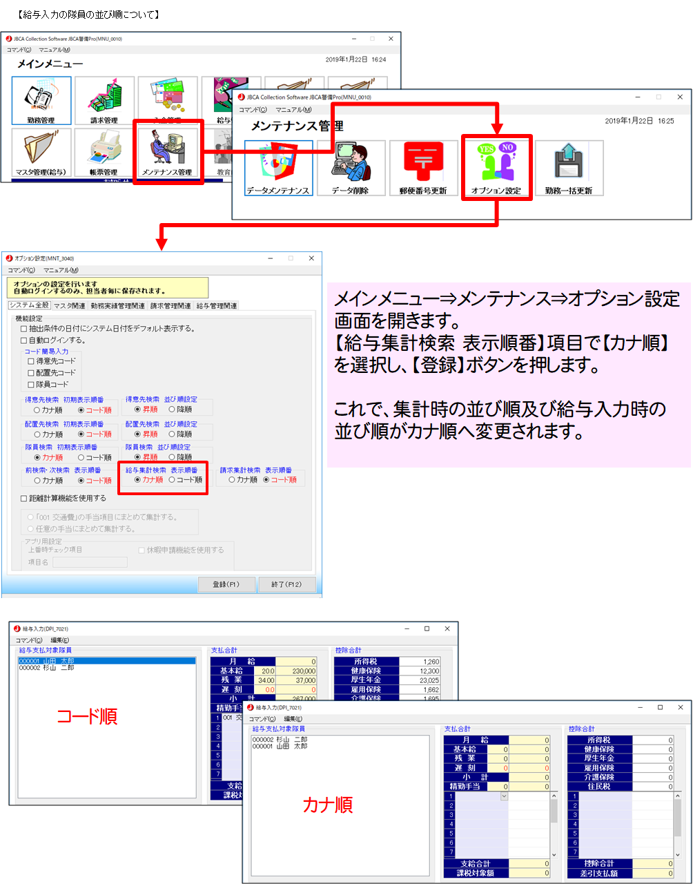 給与入力で表示される隊員を50音順ではなく、コード順で出したい。