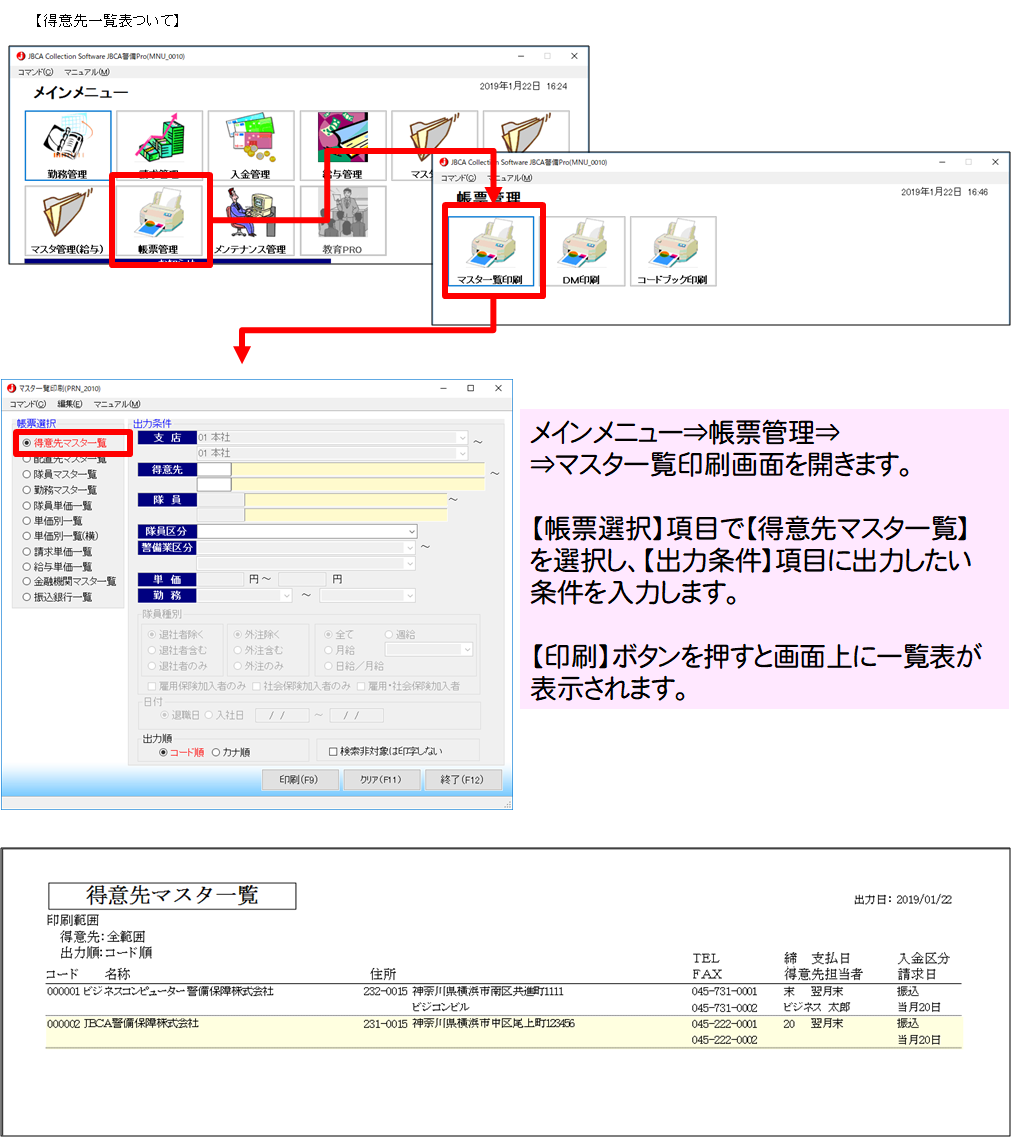 メインメニュー⇒帳票管理⇒マスタ一覧印刷画面からマスタの一覧表を出力する事ができます。