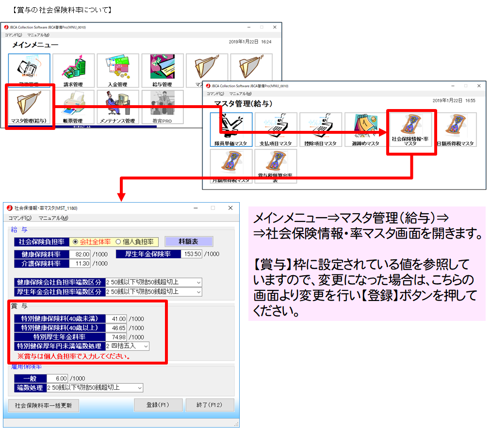 メインメニュー⇒マスタ(給与)⇒社会保険情報・率マスタ画面の賞与用の率を参照しています。