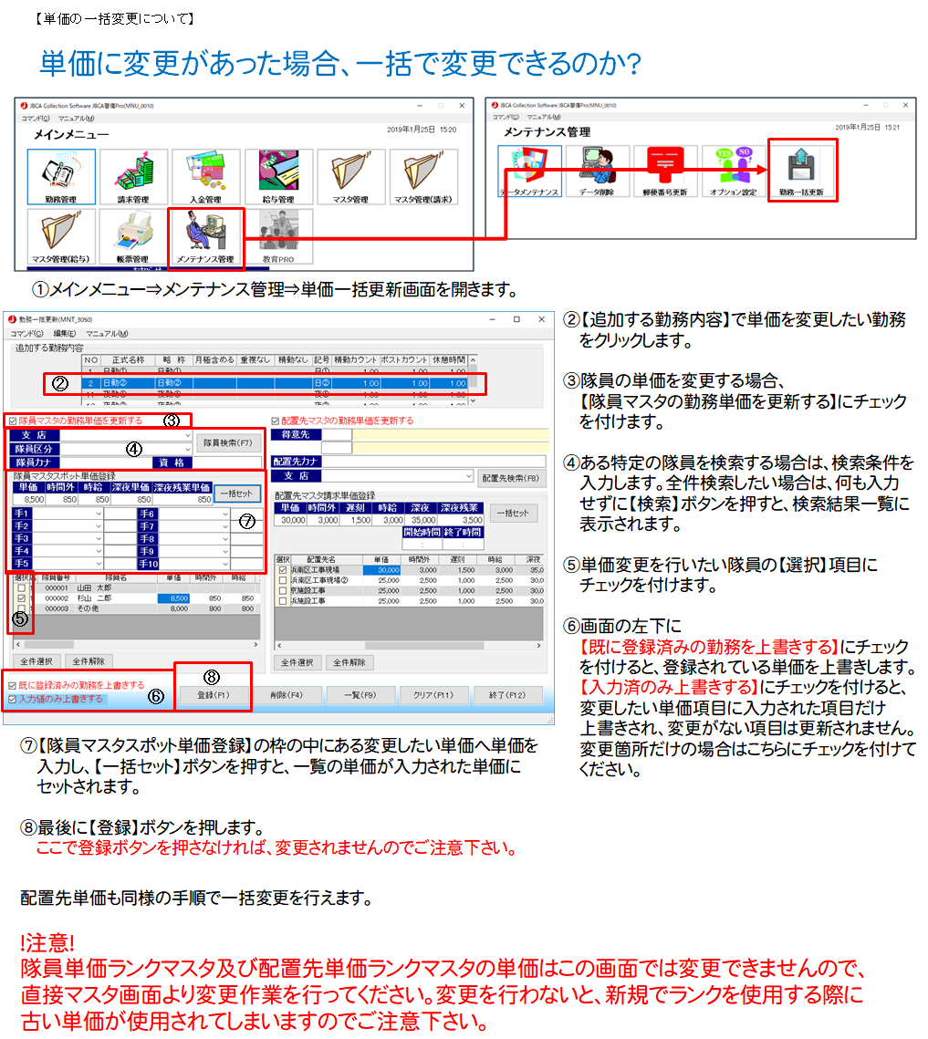 メインメニュー⇒メンテナンス管理⇒単価一括更新画面より隊員単価及び配置先の単価をそれぞれ一括で