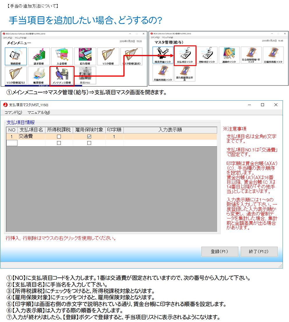 メインメニュー⇒マスタ管理(給与)⇒支払項目マスタ画面より手当項目の追加をすることができます。