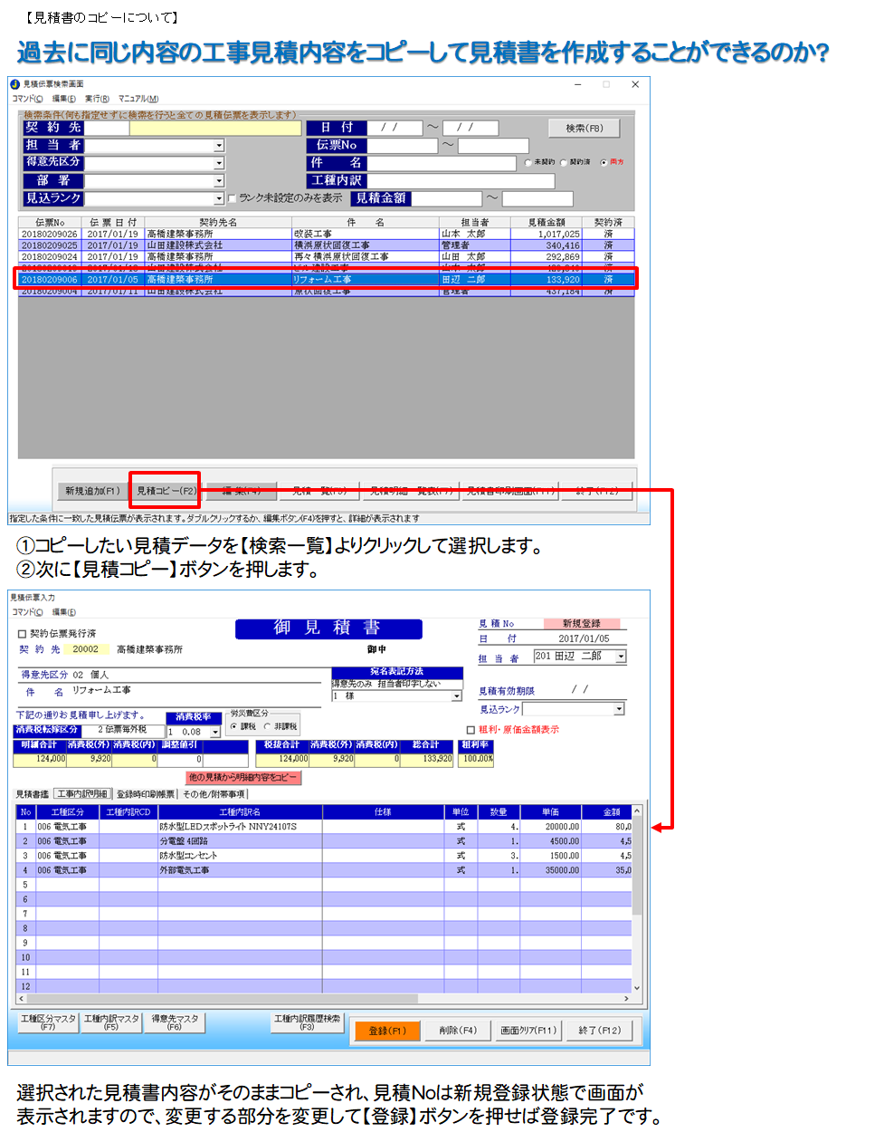 - 過去に同じ内容の工事見積内容をコピーして見積書を作成することができるのか?