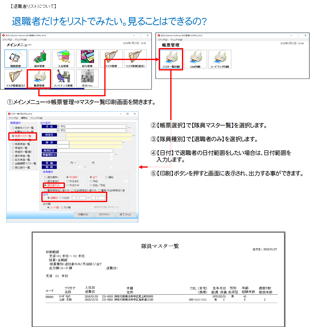 メインメニュー⇒帳票管理⇒マスタ一覧画面より隊員マスタ一覧で出力する事ができます。